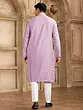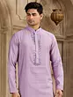 Off white and purple art silk kurta payjama displays decorative patterns all over with embroidered embellishments on the collar and sleeve ends adds to the look.